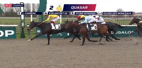 Doppio dei fantini italiani oggi a Chantilly e il successo di Giovanni Sias in sella al 3 anni Basco Bearnais, allenato da Guillermo Arizkorreta e scatto veloce ai 200 finali nella reclamare 1600 metri (euro 18.200). Lunga progressione di Quasar nella corsa successiva, una classe 2 distanza 1600 metri, il 5 anni allenato da Xavier Blanchet prevale nella corsa con dotazione di 24.700 euro.